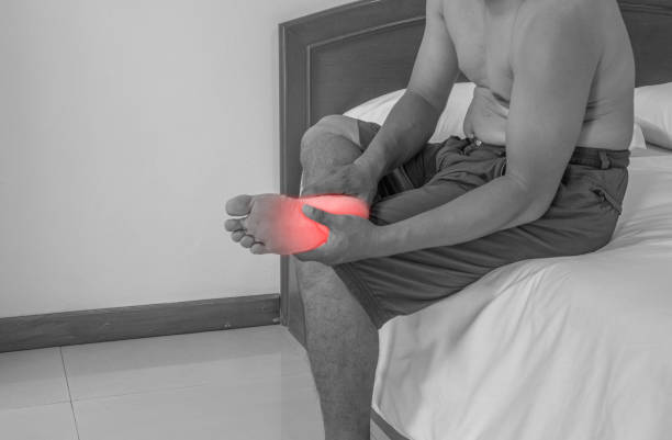 Close-up a man with Pain in the foot, a man holds hands to his feet, foot massage, cramp, muscular sprain and strain, red accent on the foot. Medical image concept.